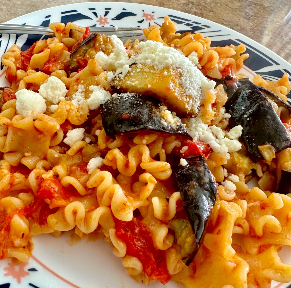 When I was in Sicily as a teenager, I loved the simple dish of macaroni. It had a light tomato sauce and a couple of slices of fried eggplant placed over it. Nothing fancy but the marriage of eggplant and macaroni is outstanding. This recipe reminds me of that.