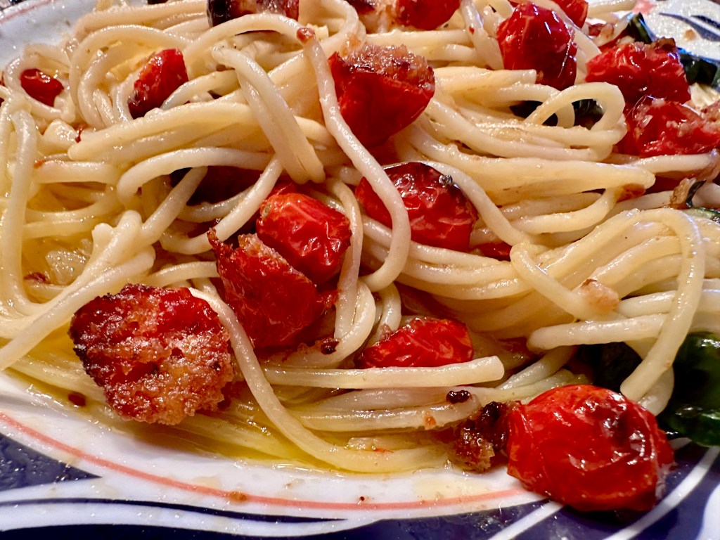 This is a very simple Sicilian dish that is made with pantry staples. If you like spaghetti with garlic and oil you will love this dish. It has the addition of roasted tomatoes in breadcrumbs that adds a flavor bomb with each bite. And the toasted breadcrumbs adds a little texture to the dish.