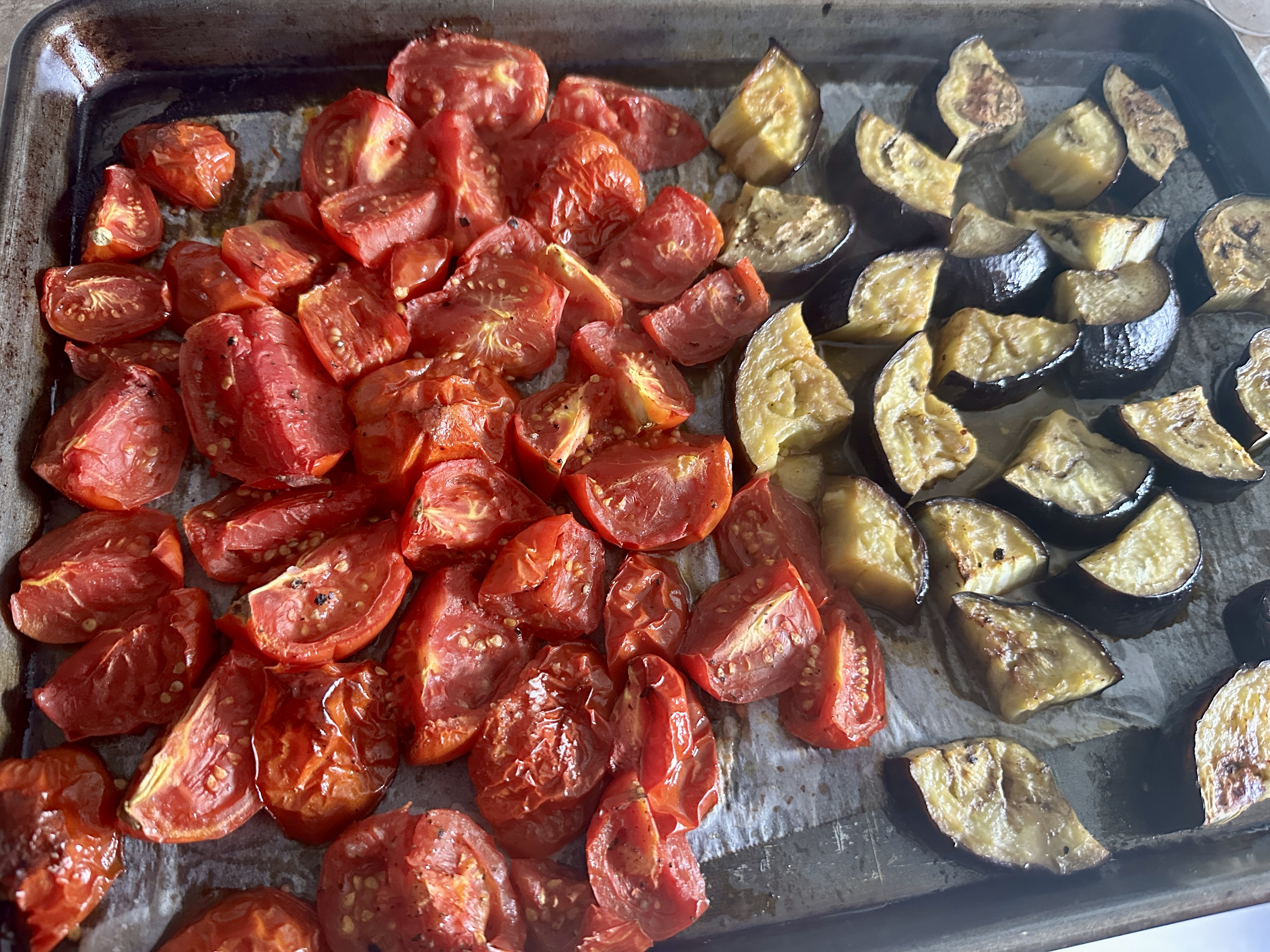 Scrape the roasted tomatoes off of the parchment and at the last minute add to the pasta. Take the pan off the heat and stir in the Pecorino Romano cheese. Toss everything gently and serve. You can add extra cheese if you like.