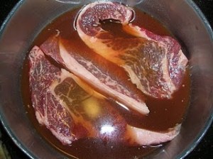 In a large bowl place the steak. Cover the steak with the red wine and sprinkle about a teaspoon of garlic powder over the steak. Allow the steak to marinade in the wine for about 5 minutes, no more.