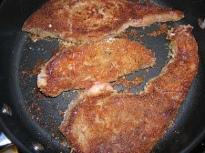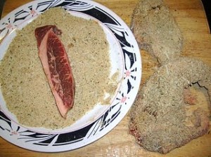 Shake off the excess wine from the steak and coat the steak in the prepared bread crumbs, pressing the bread crumbs into the steak.