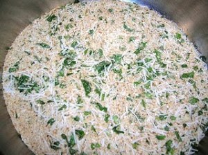 To the bread crumbs add the grated cheese, chopped garlic, chopped parsley, salt and black pepper. Mix well.