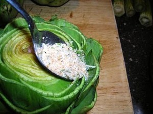 With a teaspoon, stuff each leaf of the artichoke with the bread crumb mixture. Holding the artichoke in one hand, pull the leaves back with your thumb and spoon in the bread crumbs and shake till they settle to the bottom. Go all around the artichoke and make sure each leaf is filled from bottom to top with the mixture.