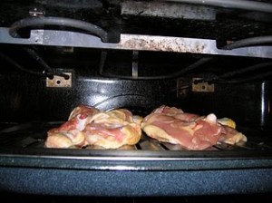 Pre-heat the broiler in your oven. Place the chicken skin side down on the broiler pan. Cook the chicken about 3-4 inches from the heat.