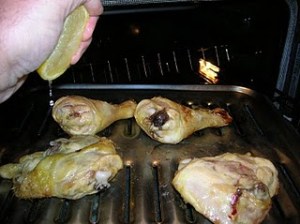 Now, turn the chicken once again, skin side down and squeeze the juice from half the lemon on the chicken, sprinkle with salt, cook 10 minutes. Turn the chicken again, skin side up and squeeze more lemon juice on that side, sprinkle with salt, cook about 6 minutes. By now the chicken should be getting nice and golden and the skin crispy. Keep an eye on it.