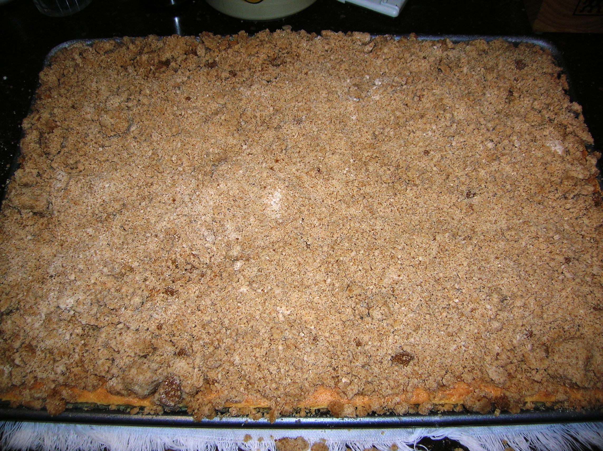 I thought I would share this recipe for crumb cake being it is so popular at family gatherings and office parties. It makes a huge pan of cake and is really easy to do, mixing boxed cake mix with other ingredients. You never have to tell anyone you used Duncan Hines. Opps! I just did.