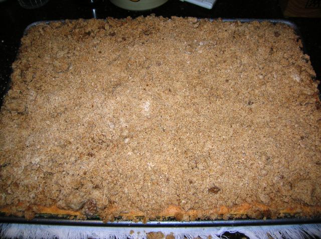 Sprinkle the crumb mixture onto the top of the warm cake, making sure you cover the entire surface. Pile it on.