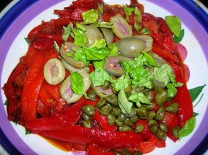 When done, transfer the pepper mixture to a bowl, then add the basil, capers, olives and red wine vinegar. Salt and pepper to taste, then stir.