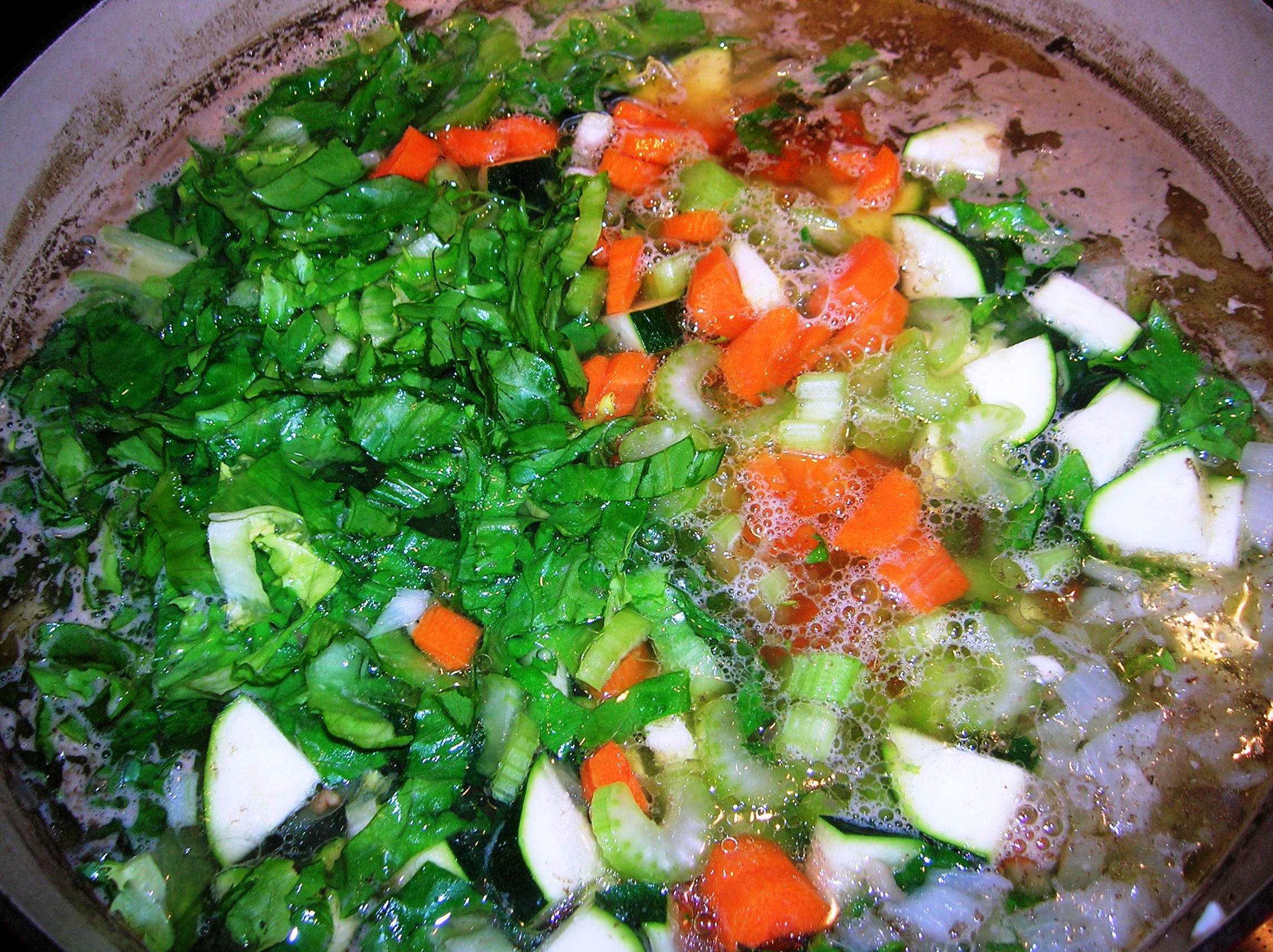 Add your celery, carrots, frozen green beans, zucchini, escarole, chopped tomatoes, basil, oregano, marjoram and bay leaf. Allow to simmer uncovered for 35 minutes.