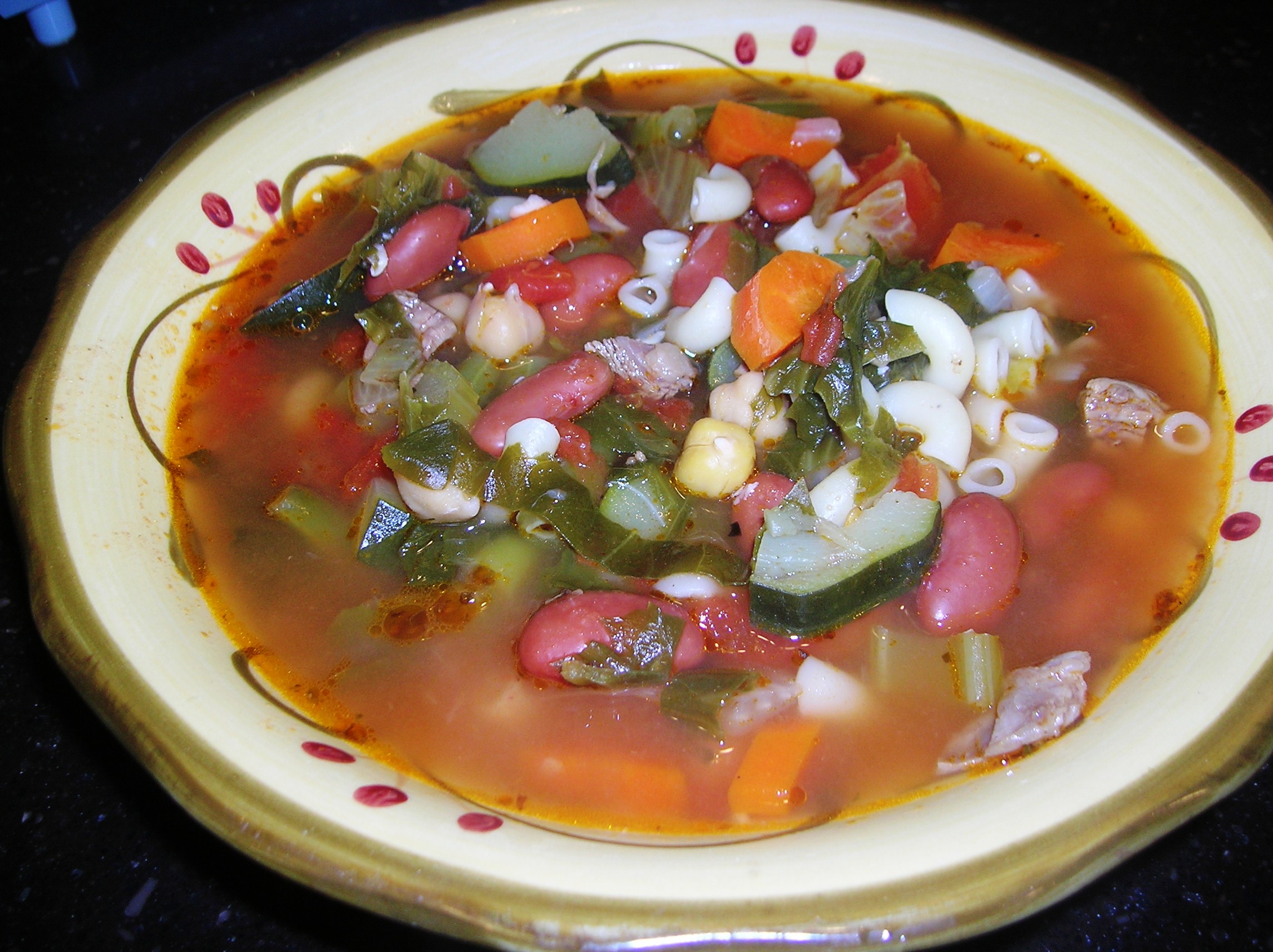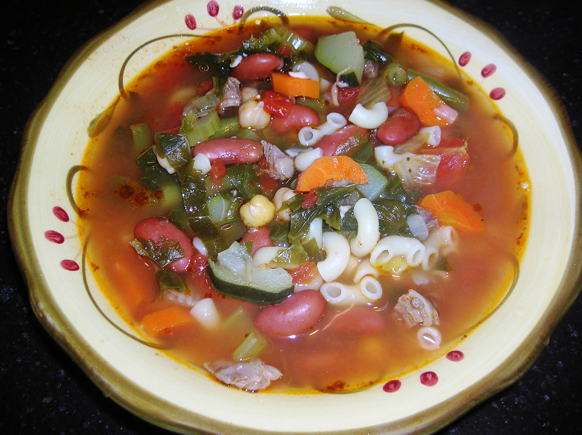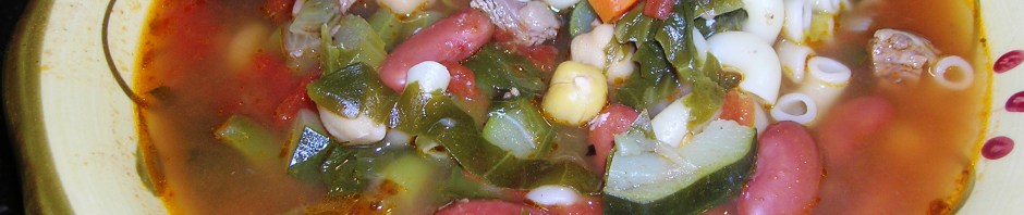 My grandmother would make the best minestrone soup! This is what I call a “kitchen sink” soup. Everything is in there but… There is no right or wrong way to make this soup. There is a right and wrong way to eat it. Just ask my sister Annette.
