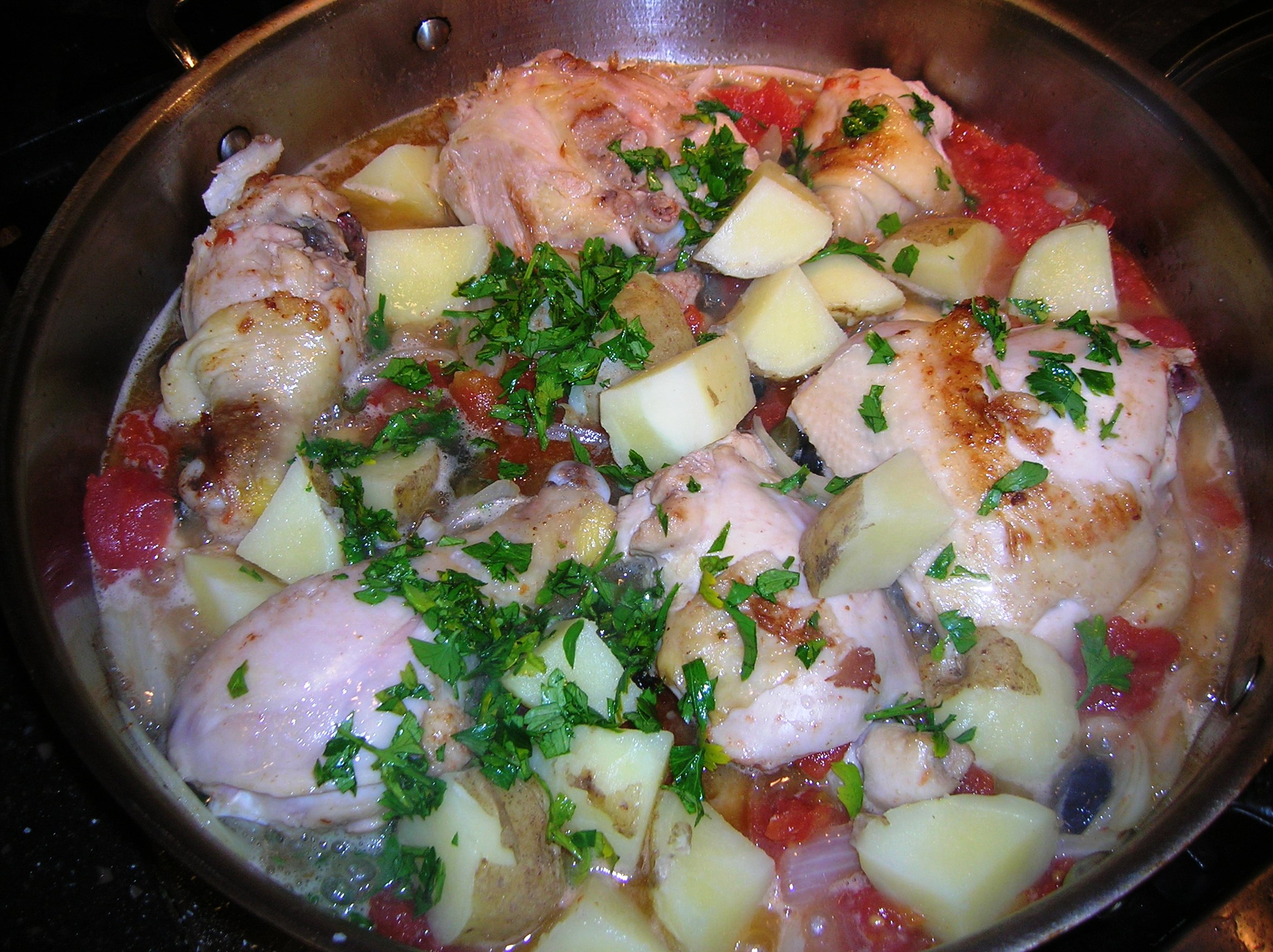 Add the parsley and potatoes and pour the white wine and wine vinegar over the chicken. Cook for about two minutes.  Cover the pan and cook till the chicken is done, about 15 minutes. Turn the chicken halfway through.
