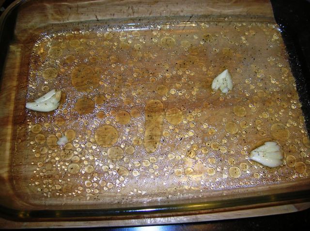 Bake the fish in a pre heated 375 degree oven for 20-25 minutes. Do not over cook the fish. Remove the garlic before serving.