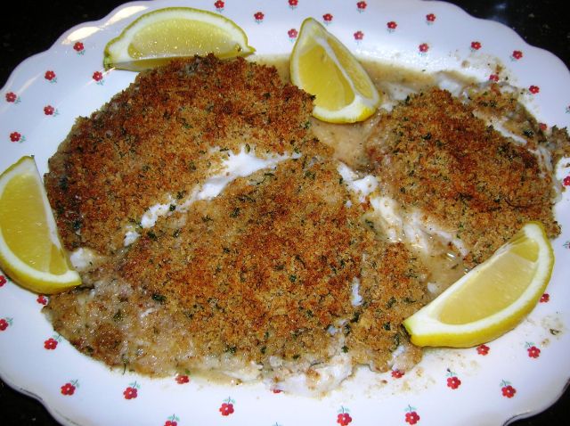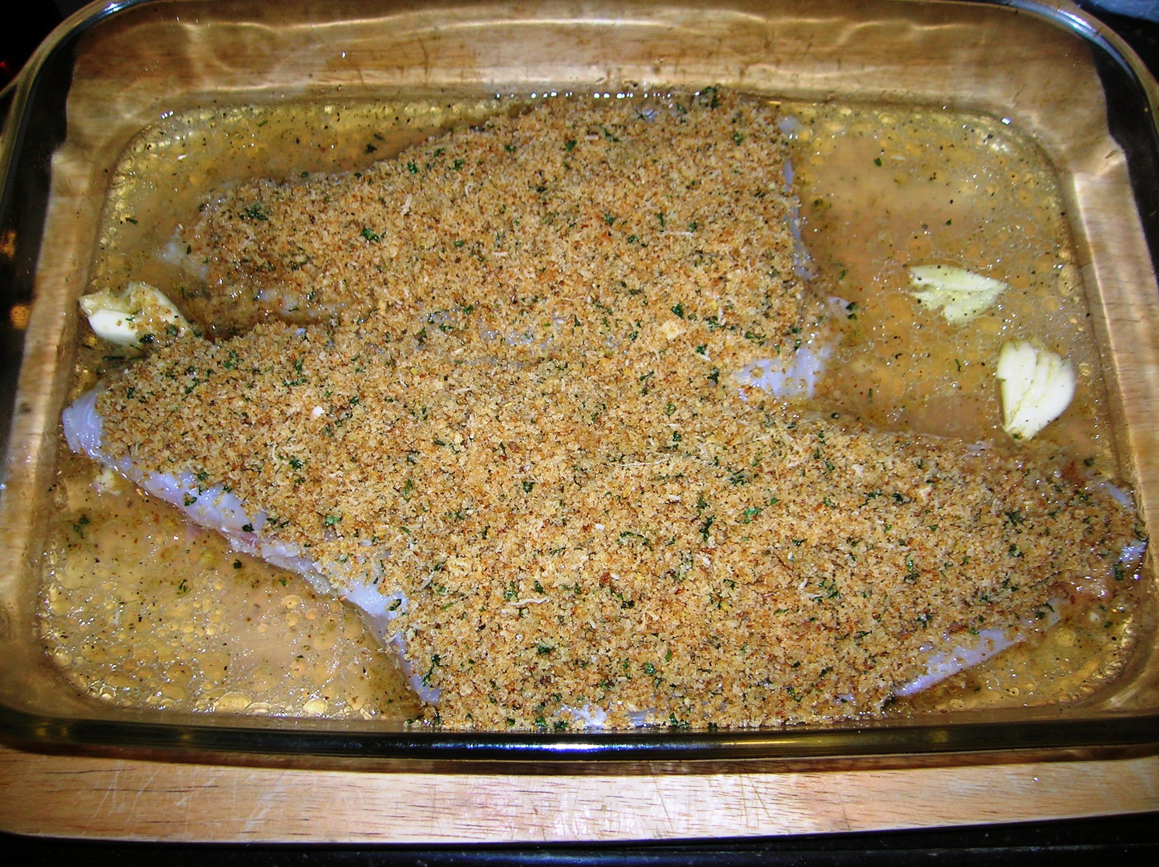 Sprinkle the prepared bread crumbs on top of the fish to coat evenly, be generous. If you have left over bread crumbs these are great sprinkled over steamed vegetables and served along with the fish, like broccoli or cauliflower.