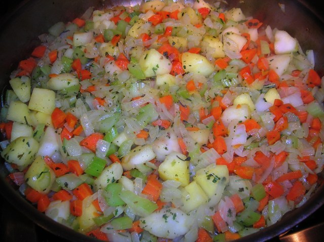 In the drippings from the bacon and sausage cook the celery, carrots, onion and apple till the vegetables get soft, stirring occasionally. Half way through cooking the vegetables add the thyme, rosemary, oregano and sage.