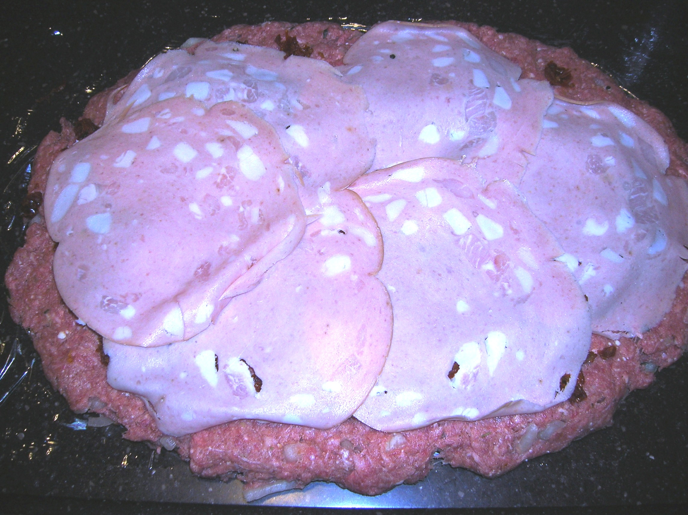 Place the sun dried tomatoes on top, next the slices of the mortadella. Next place slices of mozzarella on top of the mortadella. Leave about 1 inch of space around the meatloaf. At the end farthest from you leave about 2 inches of space. Starting on the long end closest to you, roll up the meatloaf like a jelly roll using the plastic wrap to help you lift and roll the mixture. Peel away the plastic wrap as you roll the meatloaf making sure the stuffing stays put. When you get to the end, make sure all the cheese and meat stuffing is covered by the chopped meat. If you have to, tuck in the filling and mold the meat over it.