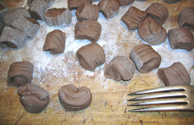 Roll the pieces of dough on the back of a fork to form ridges on the dough. Place the little barrels off to the side and use up the rest of the dough this way.