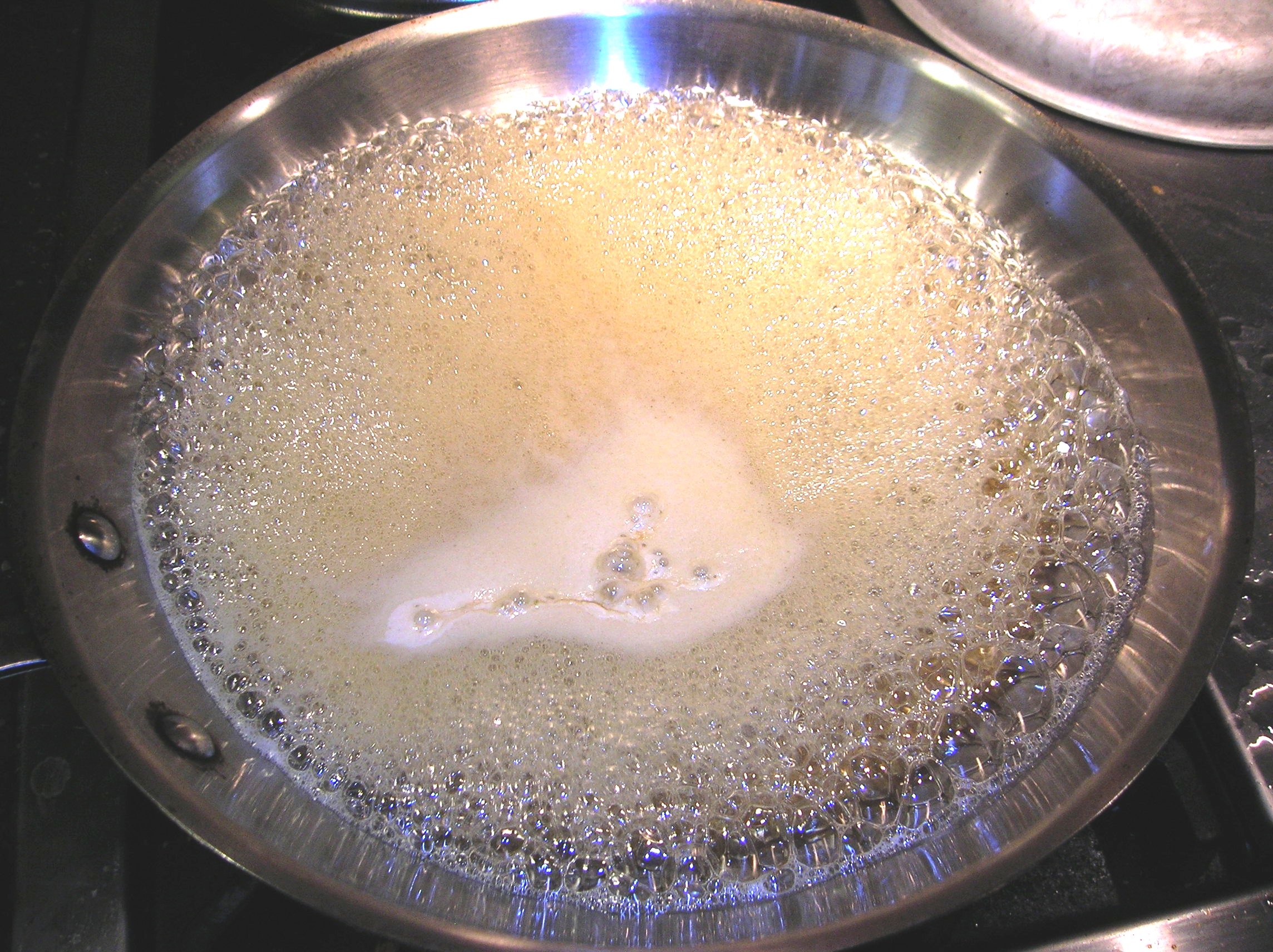 In a large frying pan or pot large enough to hold all the fried struffoli, add the honey, sugar, and water. Bring to a rolling boil. Be careful, the mixture will start to foam. Lower the heat if the foam starts to over flow. When the foam subsides and the mixture is clear and amber remove from the heat.
