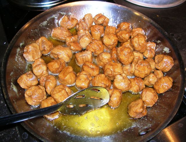 Add the fried struffoli to the honey mixture and mix well, covering all the struffoli with honey. Work quickly before the honey cools.