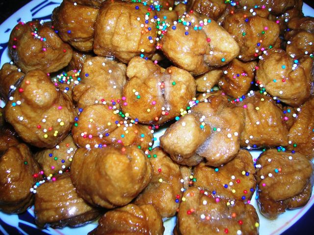 Struffoli was a traditional Neopolitan desert made for Christmas. Italians from Calabria and Sicily made these little honey balls but added red wine to the mixture which added another dimension of flavor to these honey cookies. They also shaped them a little different. Instead of the traditional little balls, the red wine struffoli was shaped like a gnocchi, like a little barrel.