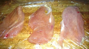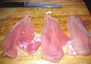 To prepare the chicken, lay the breast on your cutting board and slice width wise against the grain. You should get three slices of cutlet for each breast.
