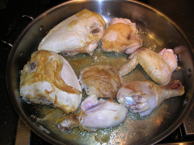 In a large saute pan heat 3 tablespoons of olive oil on medium high heat and brown the chicken about 6 minutes each side. Don’t move the chicken until after the 6 minutes. Once the skin browns it will be easier to turn when you loosen it with a spatula.  Remove the chicken from the pan and set aside.