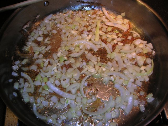 In the same pan cook onions over medium heat till translucent, about 3 minutes. Add garlic and cook 1 minute.