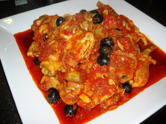Add chicken pieces and stir to combine. Partially cover and cook 45 minutes, turning the chicken once halfway through the cooking time.  Stir occasionally. Add the olives during the last 15 minutes of cooking.