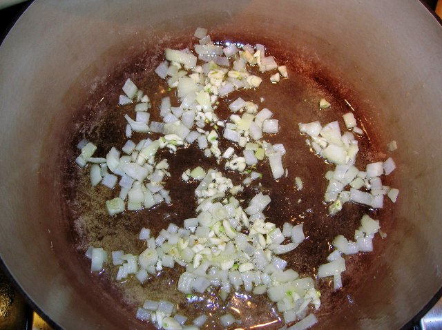 In a large sauce pot over medium heat add the olive oil. Saute the onions until translucent. Add the garlic and cook 1 minute or until they just start to turn golden. Add the white wine and cook down 2 minutes.