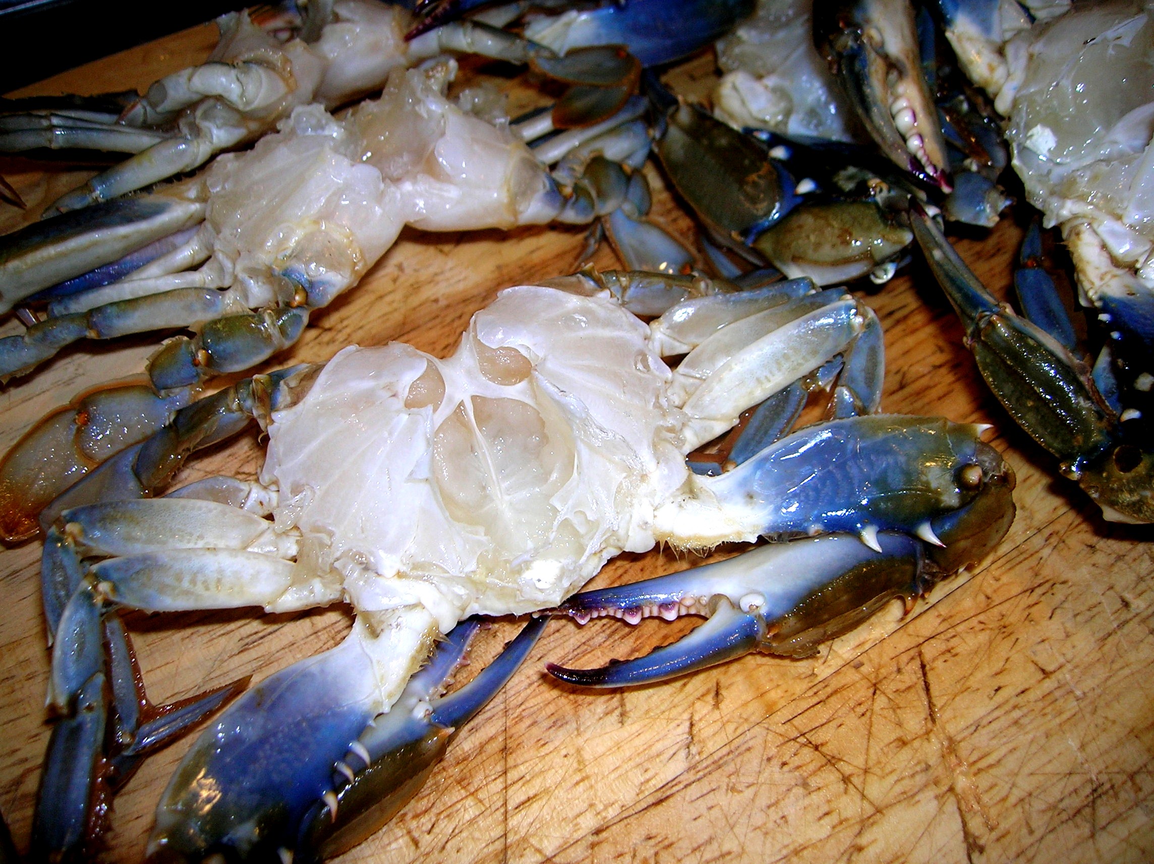 To clean the crabs turn them over and you will notice on the bottom there is either a pyramid shape (female) or a long narrow shape (male) on the crabs underside. If you get a knife or your nail under this shape and pull it towards the back of the crab ( like a pop top can) you can pry off the top of the crab shell. Discard the top of the shell along with the mouth portions and the gills of the crab that are right under the top shell. Rinse the crab under cool water and you’re good to go.