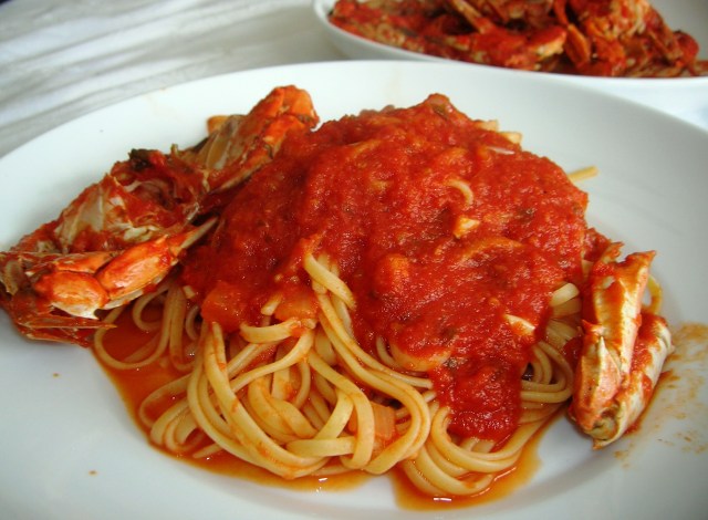 Drain the pasta and serve with the crab sauce. Sprinkle with Parmesan or Romano cheese.