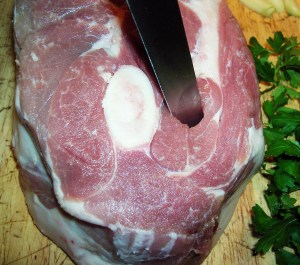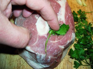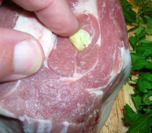 Place the pork roast on your work surface and with a long thin knife makes a hole about two inches deep into the roast. Push a piece of garlic into the hole with your finger. Push on top of the garlic a few leaves of fresh parsley. Make these holes about 4 inches apart all around the pork roast filling them with the garlic and parsley. If a clove of garlic is too large cut it in half. The piece of garlic should be about as large as your thumb nail.