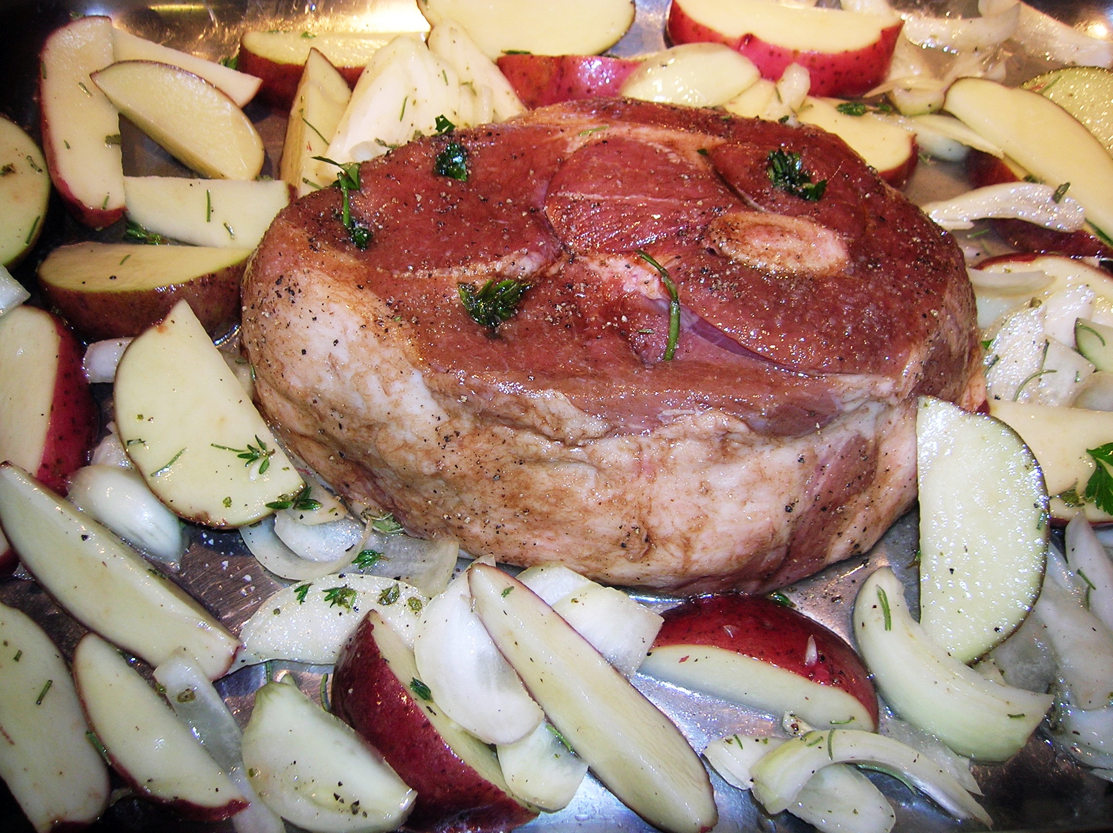 Place the roast in the center of your roasting pan. In a large bowl combine the sliced onion and potato wedges. Chop any remaining garlic and add to the potatoes and onions along with the rosemary, thyme and sage.  Pour the rest of the olive oil over the mixture and season with salt and pepper. Mix well.