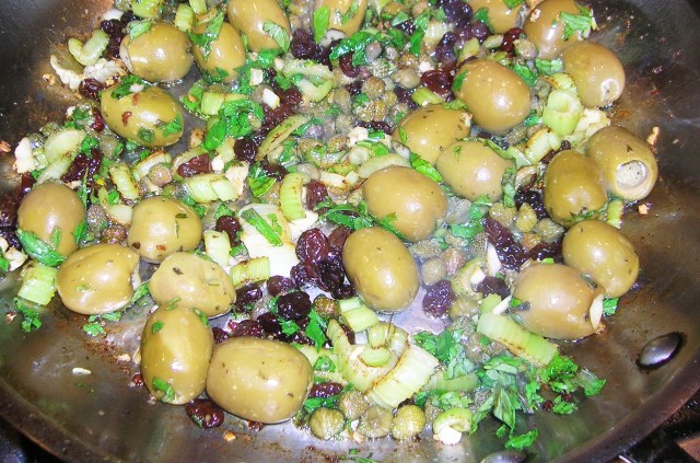 Add the garlic and cook till the garlic just turns golden. Do not burn. Add the olives, capers, mint and raisins. Cook for about 3 minutes.