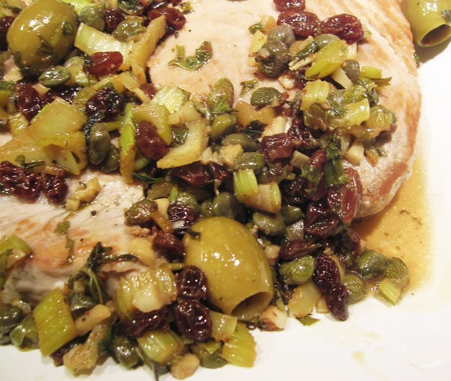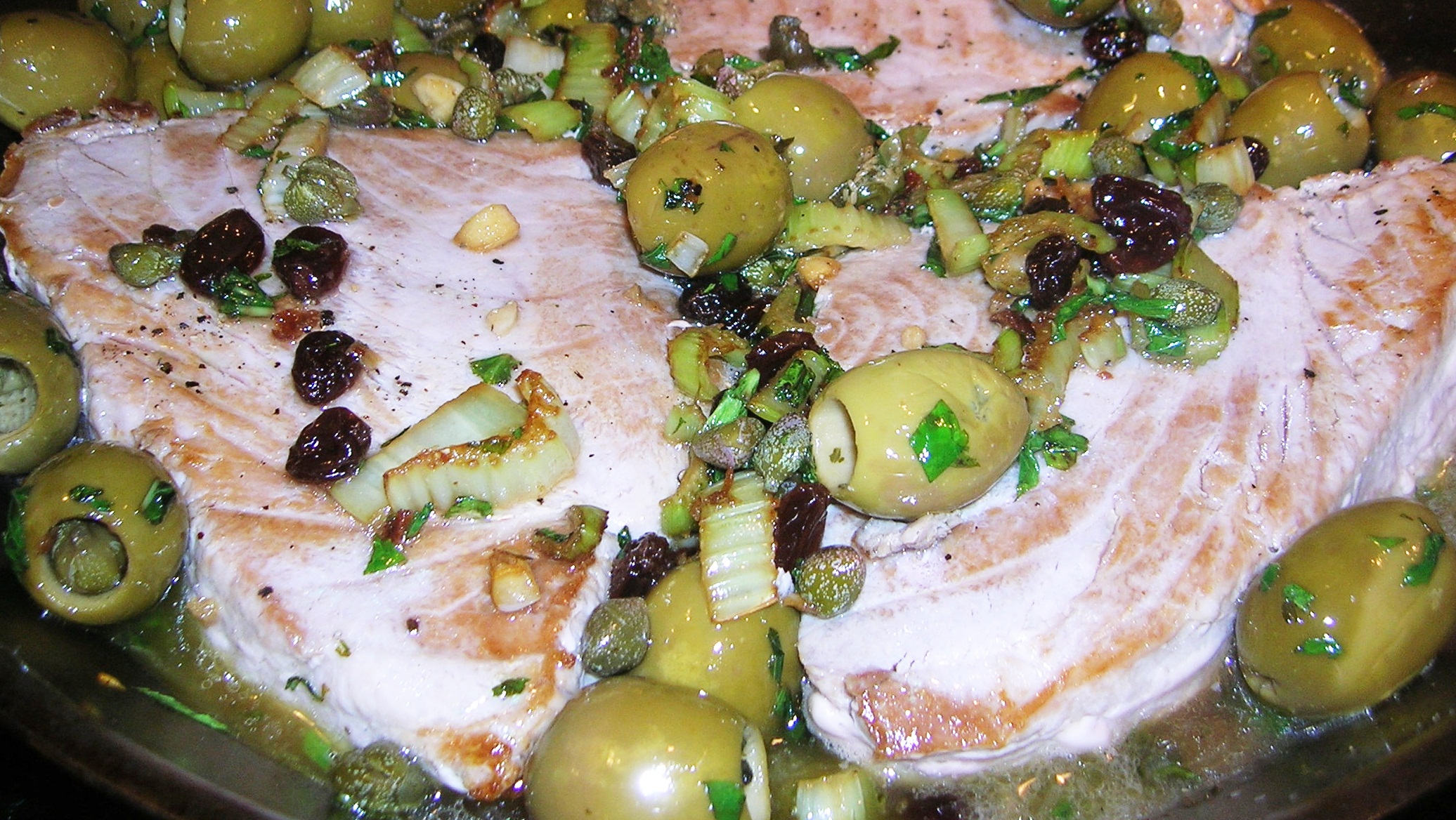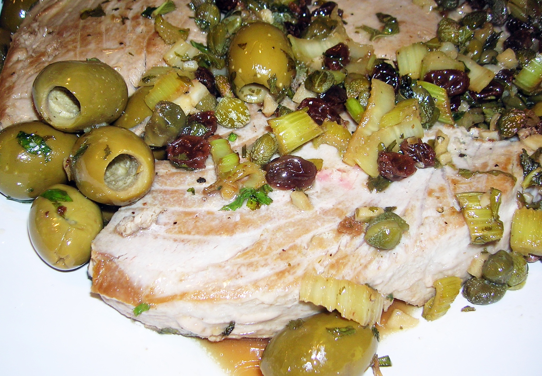 This dish is well-known in my father’s town of Ragusa. It is served cold or at room temperature. The tuna can be broken in pieces and served with the accompanying olives, capers and celery. In the tradition of a caponata, Tonno a la Stemperata is traditional Sicilian dish bursting with flavors of vinegar, olives, mint, capers and garlic. I actually enjoy eating this dish in all its stages, hot, room temperature and cold. It takes on a different character at each level. But I like it best the next day with a loaf of Italian bread and a glass of beer. It’s a perfect summer time meal, prepared the previous day and eaten cold with a salad at your leisure. Don’t be afraid of the raisins, like many ingredients, they take on a totally different flavor when prepared this way and lend just a touch of sweetness to the vinegar and briny taste of the olives. A sweet, sour, savory experience with a background of mint. An outstanding flavor experience! Hope you enjoy it.