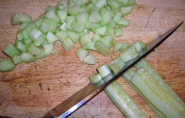 Peel and cut the cucumber in half. Cut a V in the center to remove the seeds. Cut each half length wise into four pieces and cut into a 1/4 inch dice. Do the same with the other half.