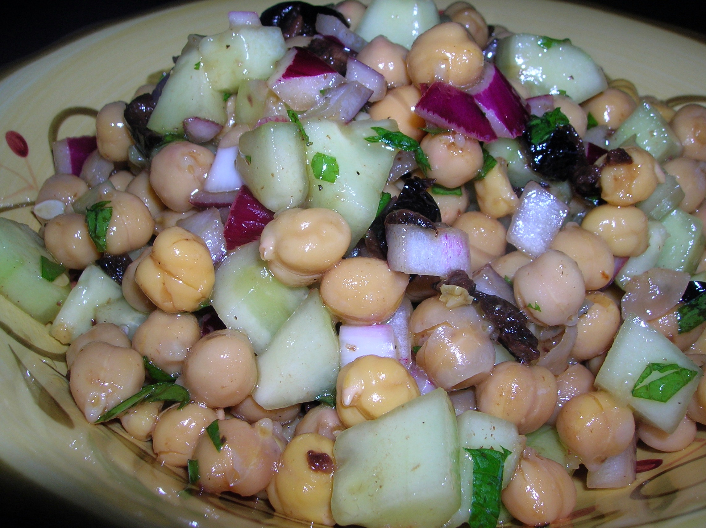 In a large bowl add the chick peas, cucumber, red onion, oil cured olives, and mint. Toss gentley. Add the olive oil, red wine vinegar and salt and pepper. Chill the salad at least an hour before serving. When ready to serve, mix well and serve with plenty of Italian bread.
