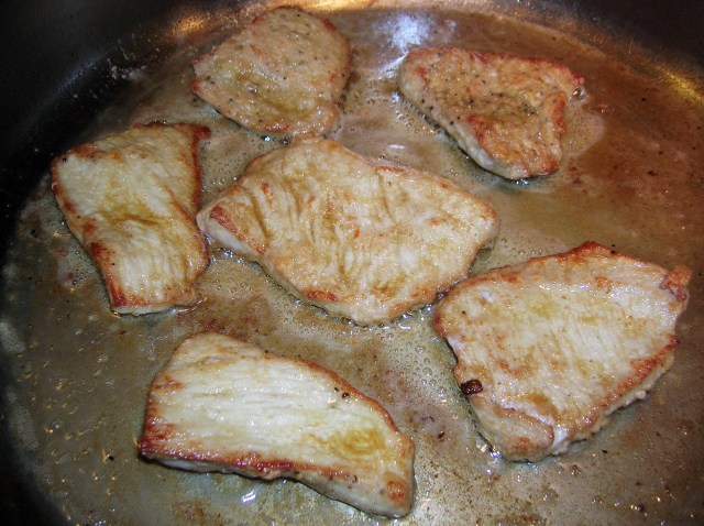 Add the remaining butter and olive oil.  Spread the flour on a flat place. When the butter is melted dip the scaloppine into the flour, coating both sides. Shake off excess flour and lay the slices in the pan.