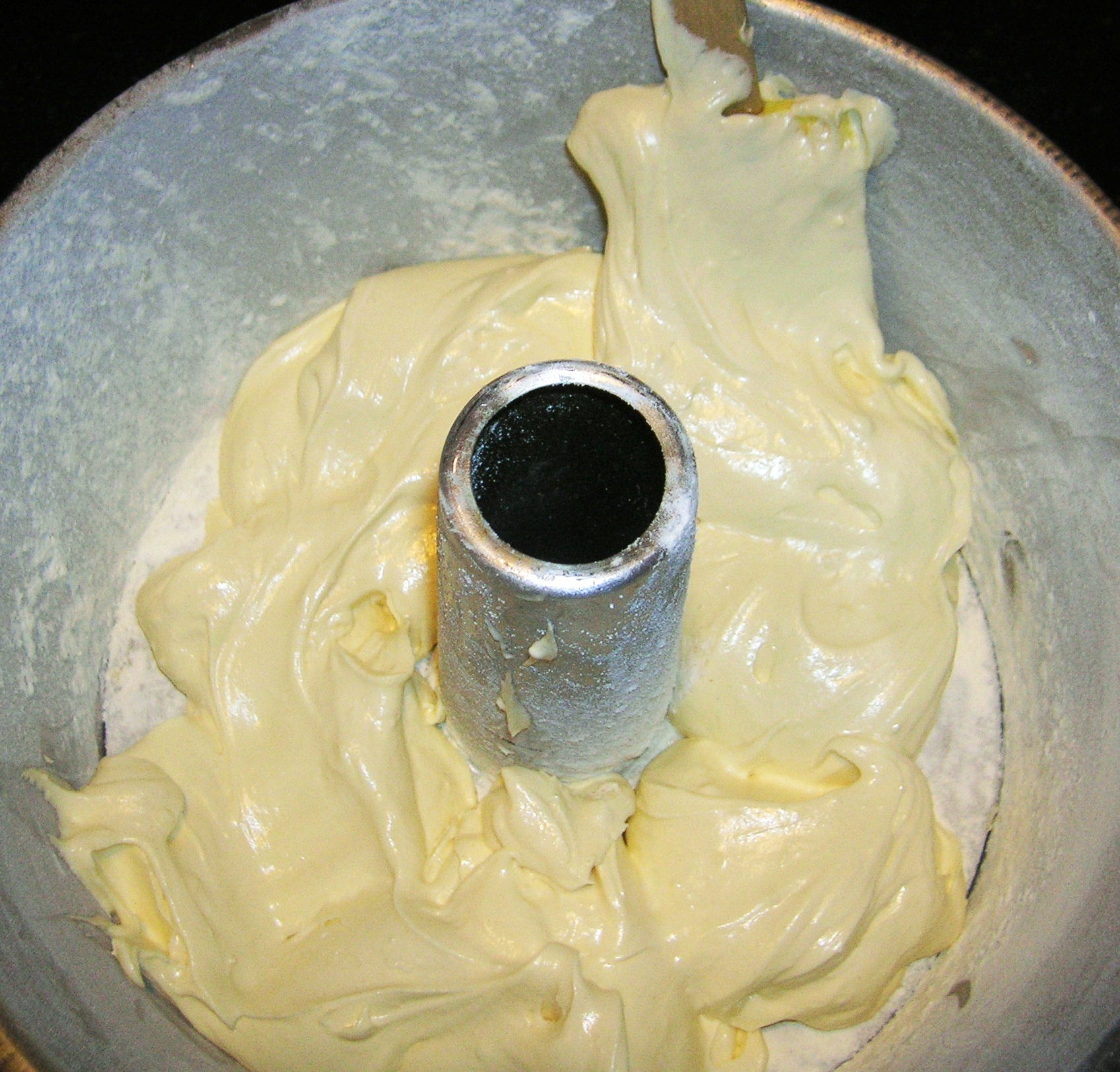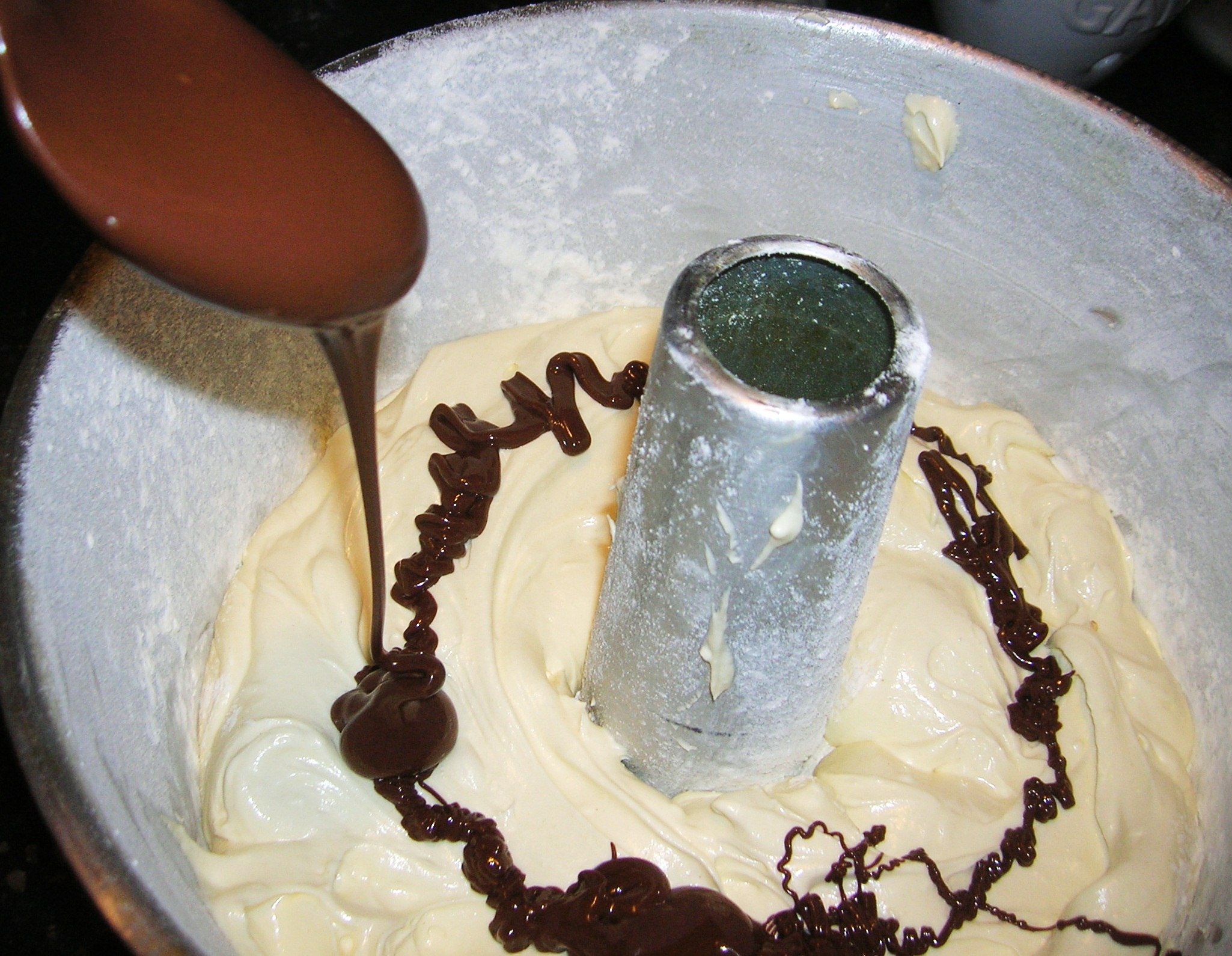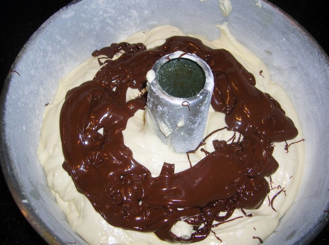 Pour half into the prepared tube pan.