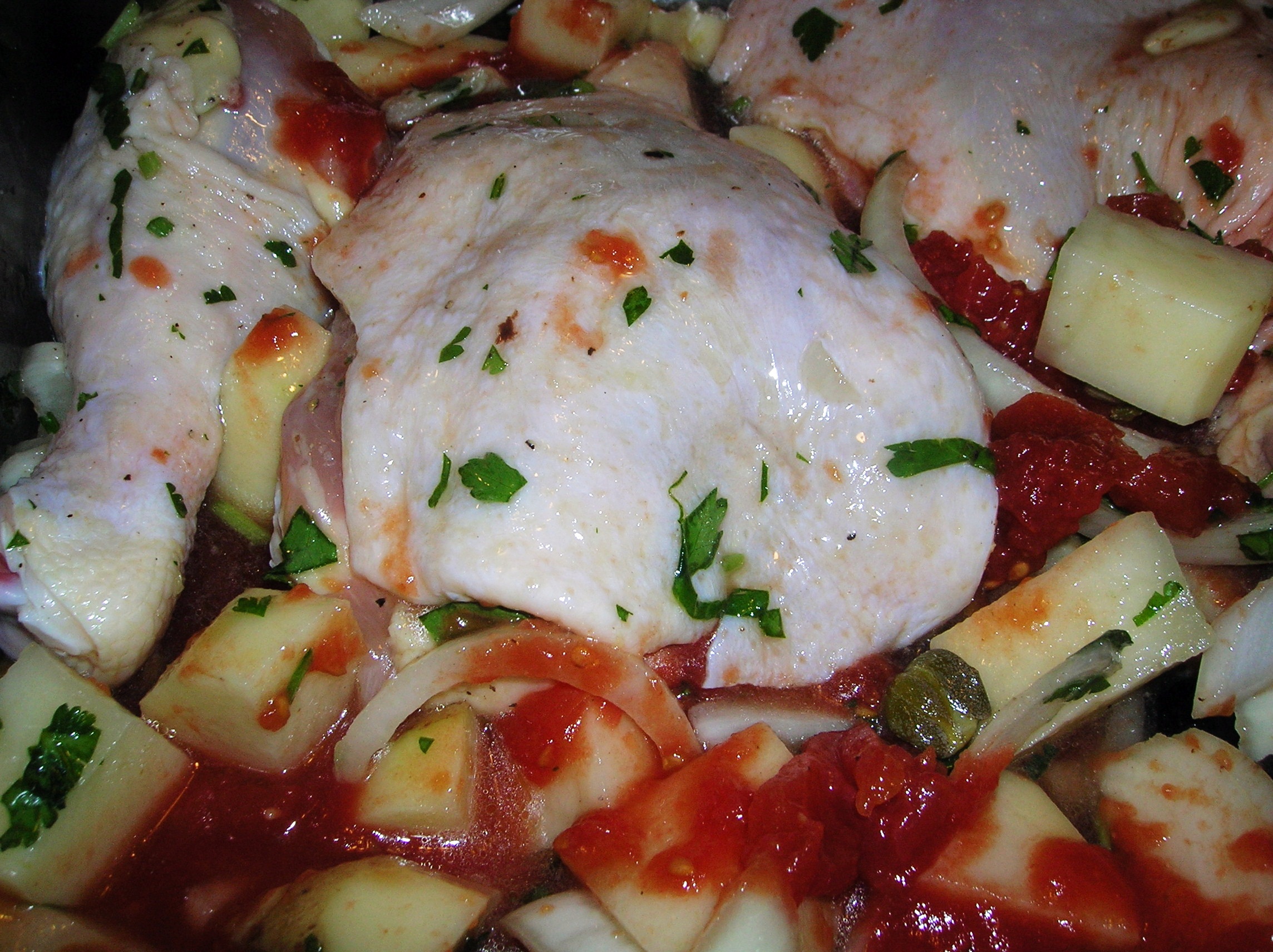 Remove from oven and let rest 15 minutes before serving. Top the chicken with the sauce of capers and olives and serve with the potatoes and onions on the side..