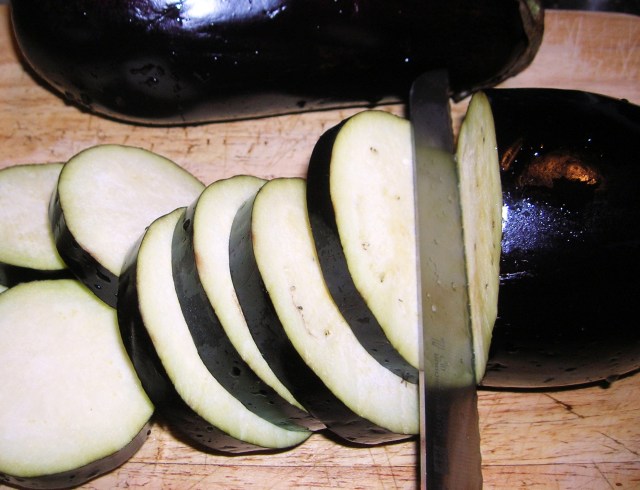 Leave the skin on the eggplant. Slice the eggplant cross wise into 1/4 inch rounds.