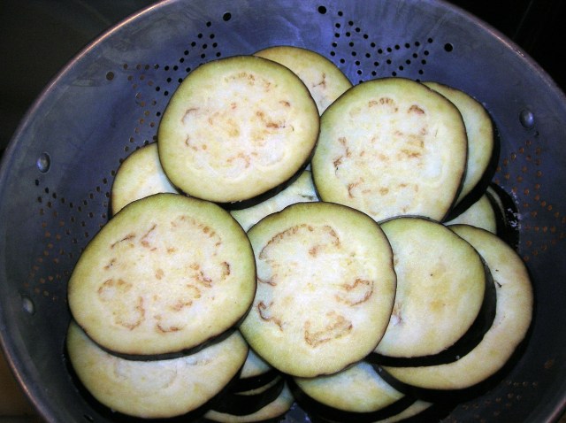Salt the slices of the eggplant with the kosher salt and place in a colander. Once all the eggplant is cut and salted and placed in the colander, place a plate over the top and cover with a heavy weight, like a cast iron pan. Allow the eggplant to drain that way over a dish for an hour.