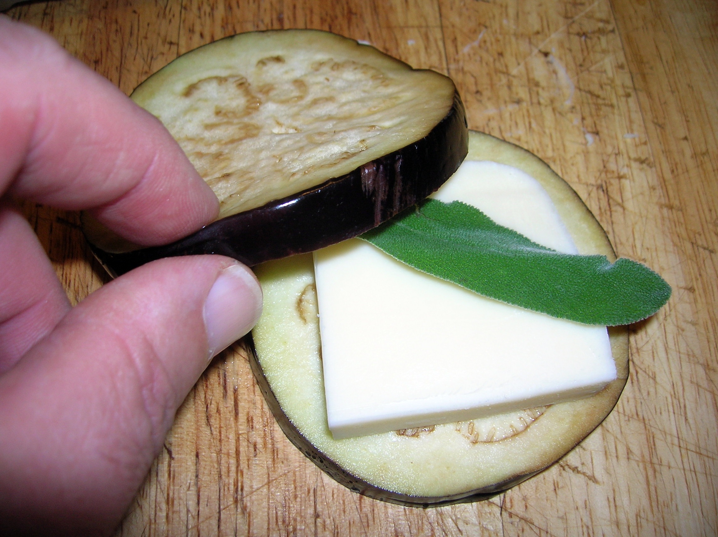 Place a slice of Fontina cheese on top of a slice of eggplant and top with one sage leaf. Cover the sandwich with the matching eggplant slice and set aside. Assemble the rest of the sandwiches with the remaining eggplant, sage leaf and cheese.
