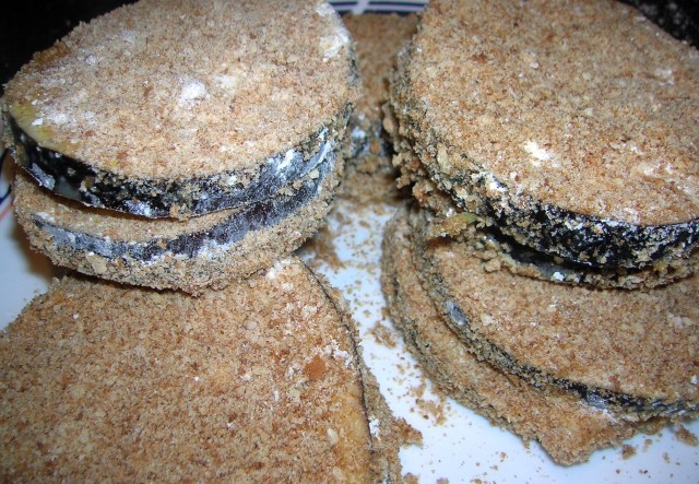Dip your assembled eggplant sandwich first in the flour, coat both sides, then dip in the egg wash both sides, and finally coat in the bread crumbs. Place the sandwich in another dish to dry. Continue with the remainder of the eggplant sandwiches.