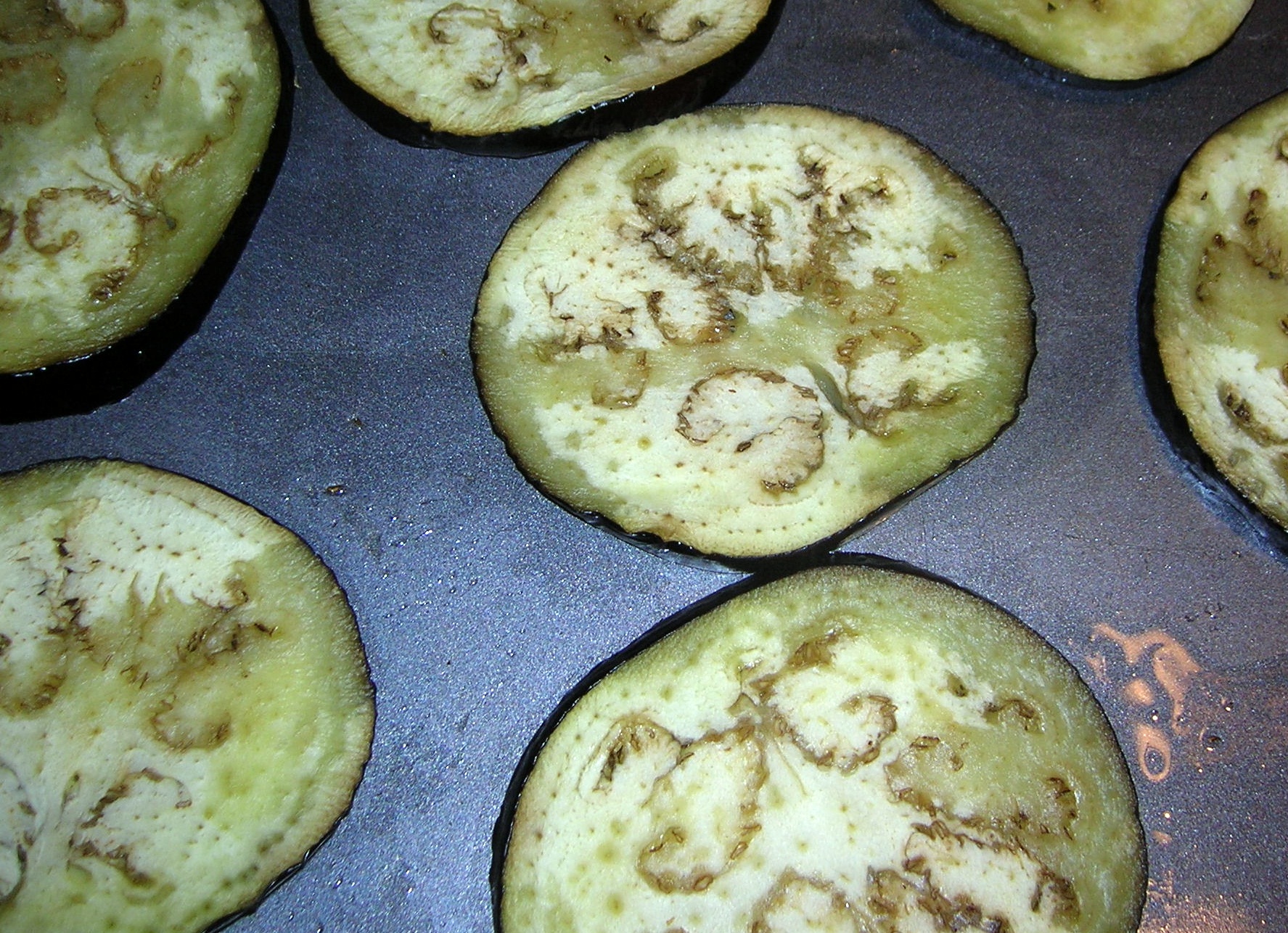 Place about 1/4 cup olive oil on a flat sheet pan and spread evenly. Place the eggplant on the pan and flip them over to absorb some of the oil on the other side. Use two pans so you don’t crowd them. Place in a 375 degree oven for 15 minuets.