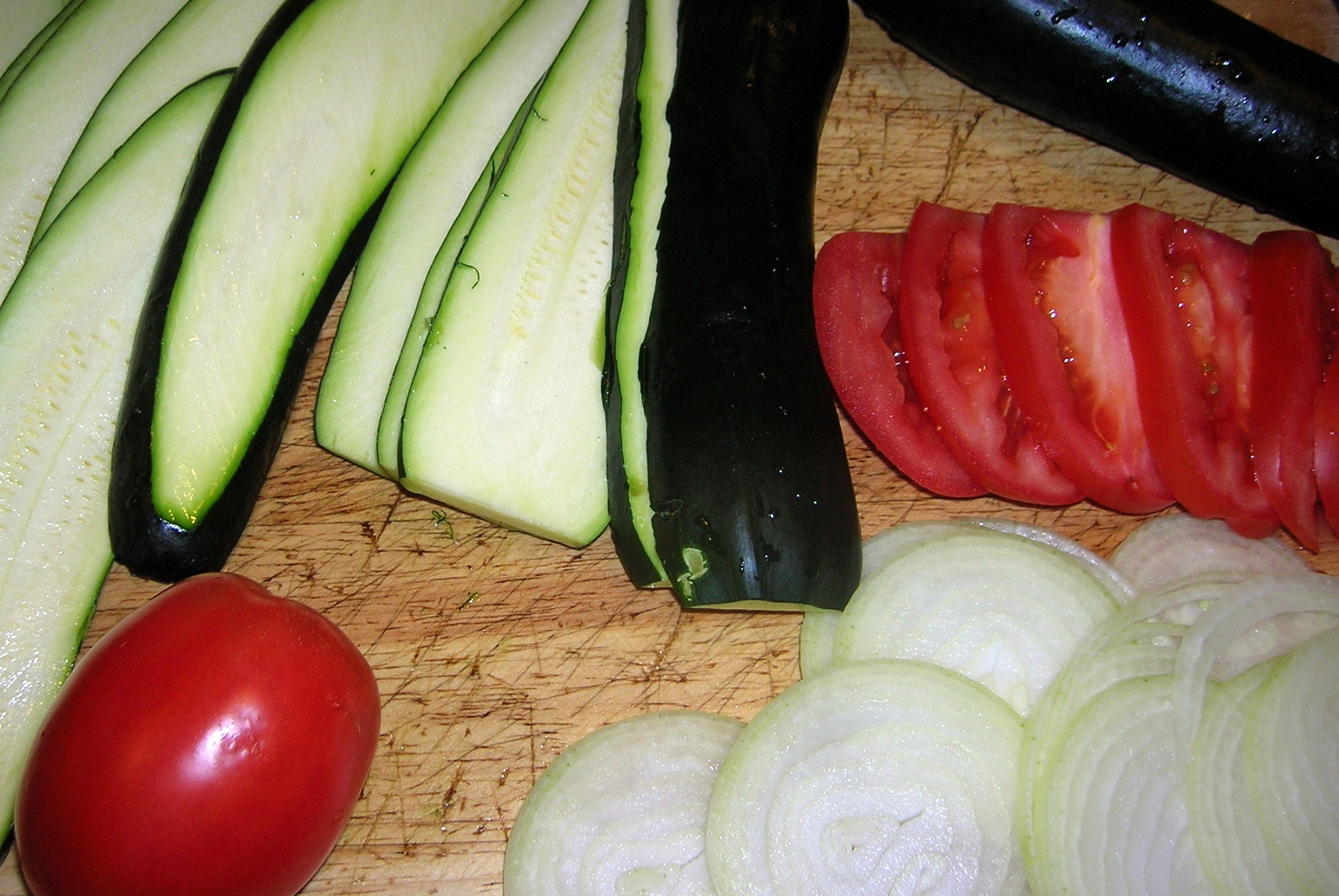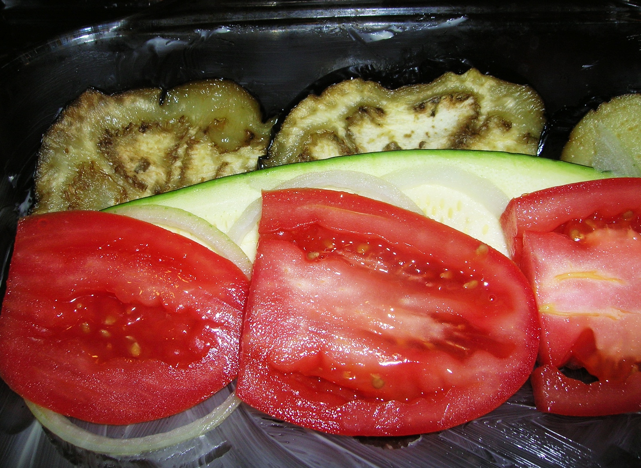 Butter a 13″x 9″x 2″ Pyrex baking dish. Place a layer of eggplant against the side of the pan. Place on top of the eggplant the zucchini then the tomato and then the onion.