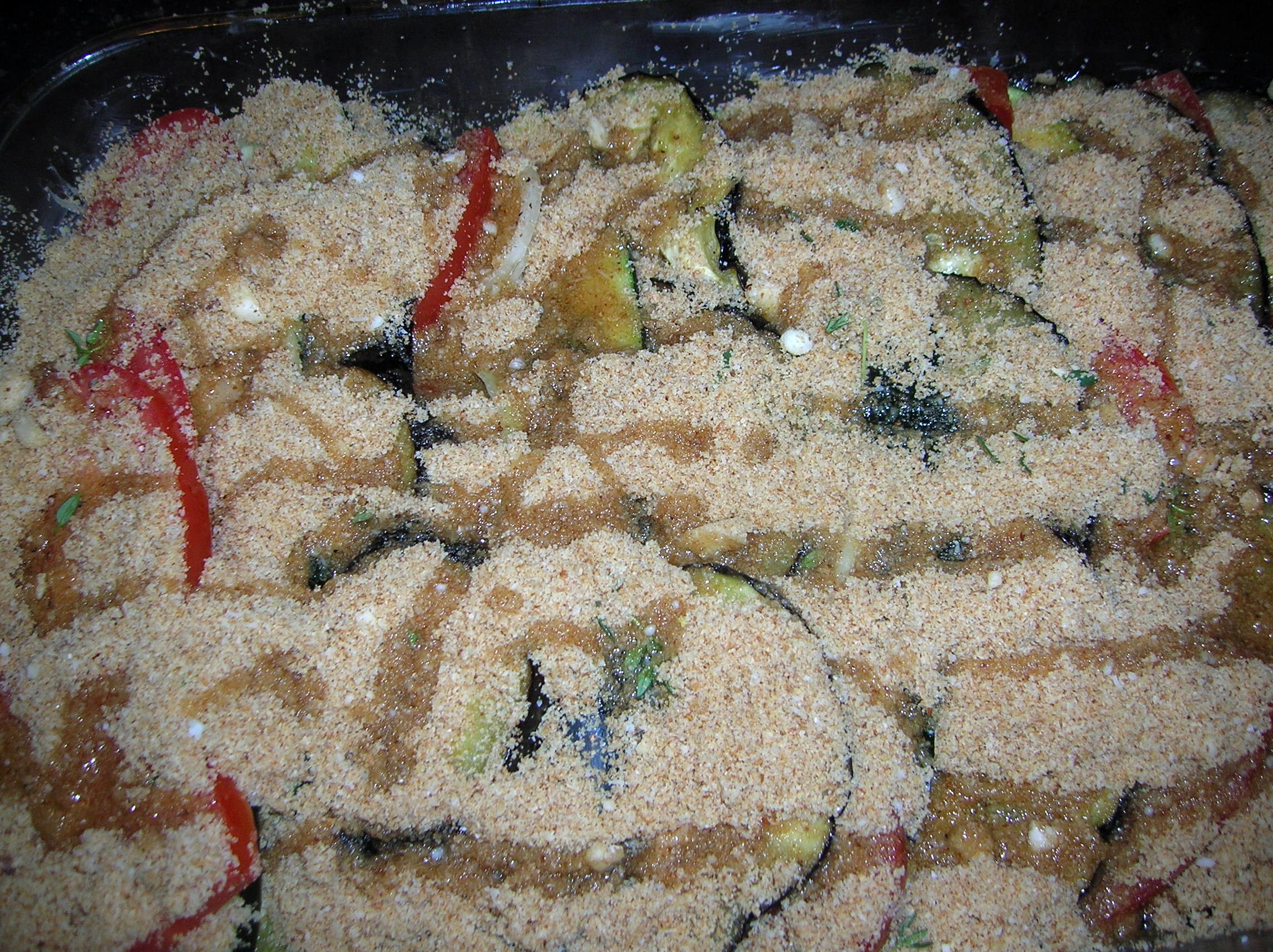 In the meantime, slice the zucchini, tomatoes and onions. Prepare the breadcrumbs by mixing together the minced garlic, Romano cheese and thyme with the bread crumbs. Add 1/4 teaspoon of salt and 1/4 tsp of pepper. Add 2 tablespoons of olive oil and mix well.