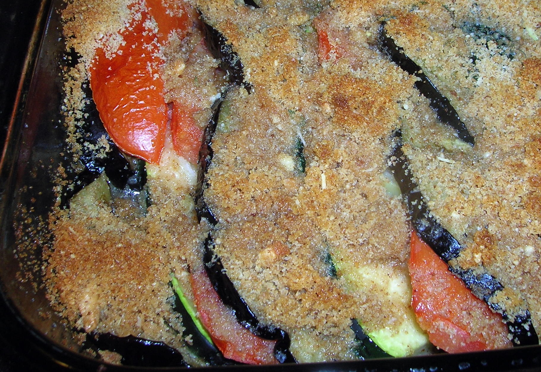 Bake in a 350 degree oven for 35 minutes, or until the bread crumbs are browned and vegetables tender. Allow to cool slightly before serving. Can also be eaten at room temperature.