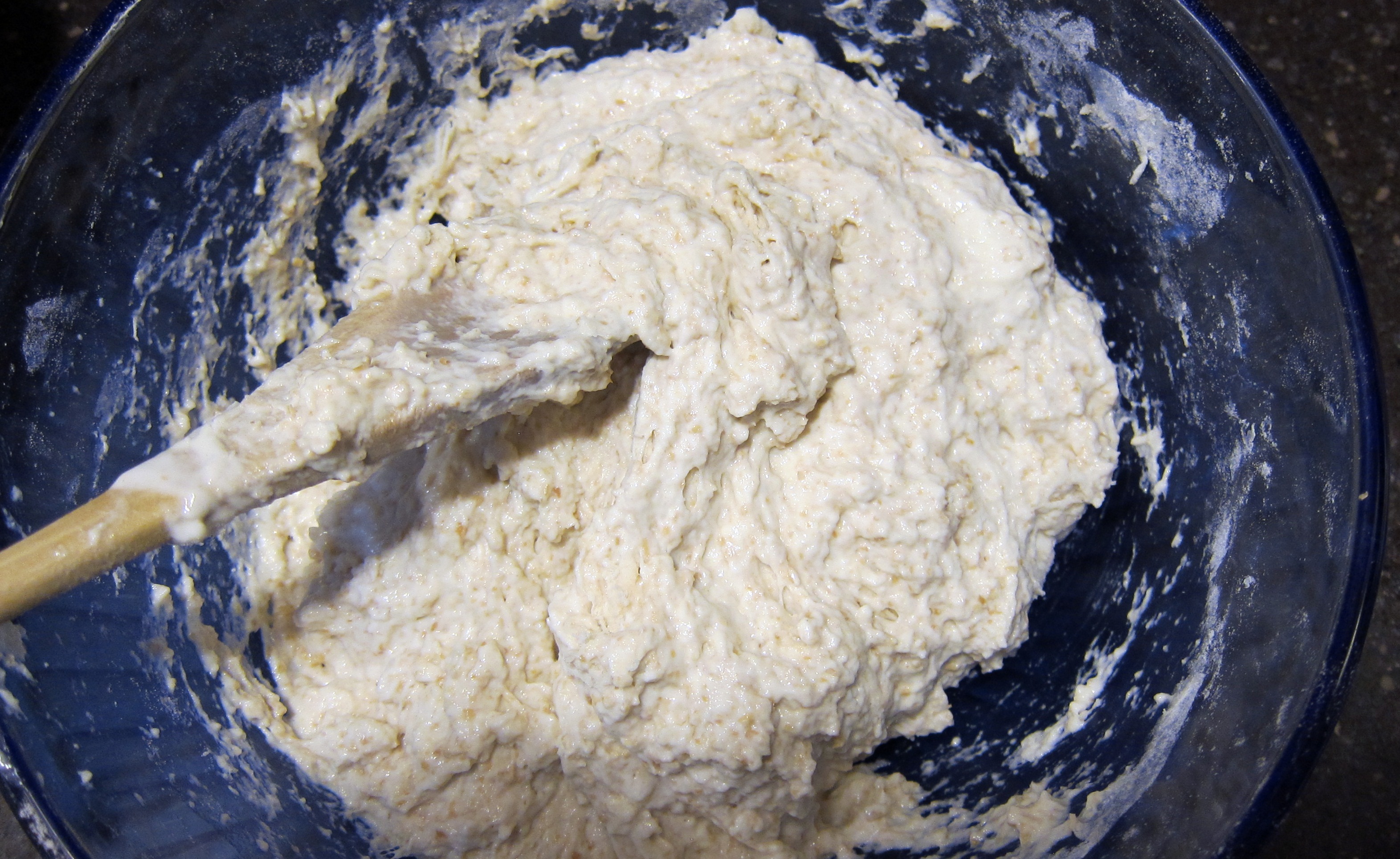 Some starter might be thinner than needed for this recipe. The best way I can figure to have the right starter consistency is to place the 1/4 cup starter in a large mixing bowl and add 1-2 tablespoons of flour and stir till you get the consistency of a dough that will just about hold its own shape. This amount of flour is above the 16 ounces needed for the recipe. Add the warm water to your starter ball and mix to dissolve the starter as much as possible. Add the salt and stir. Add about 8 ounces of the flour and stir with a wooden spoon until you have a sticky mass.