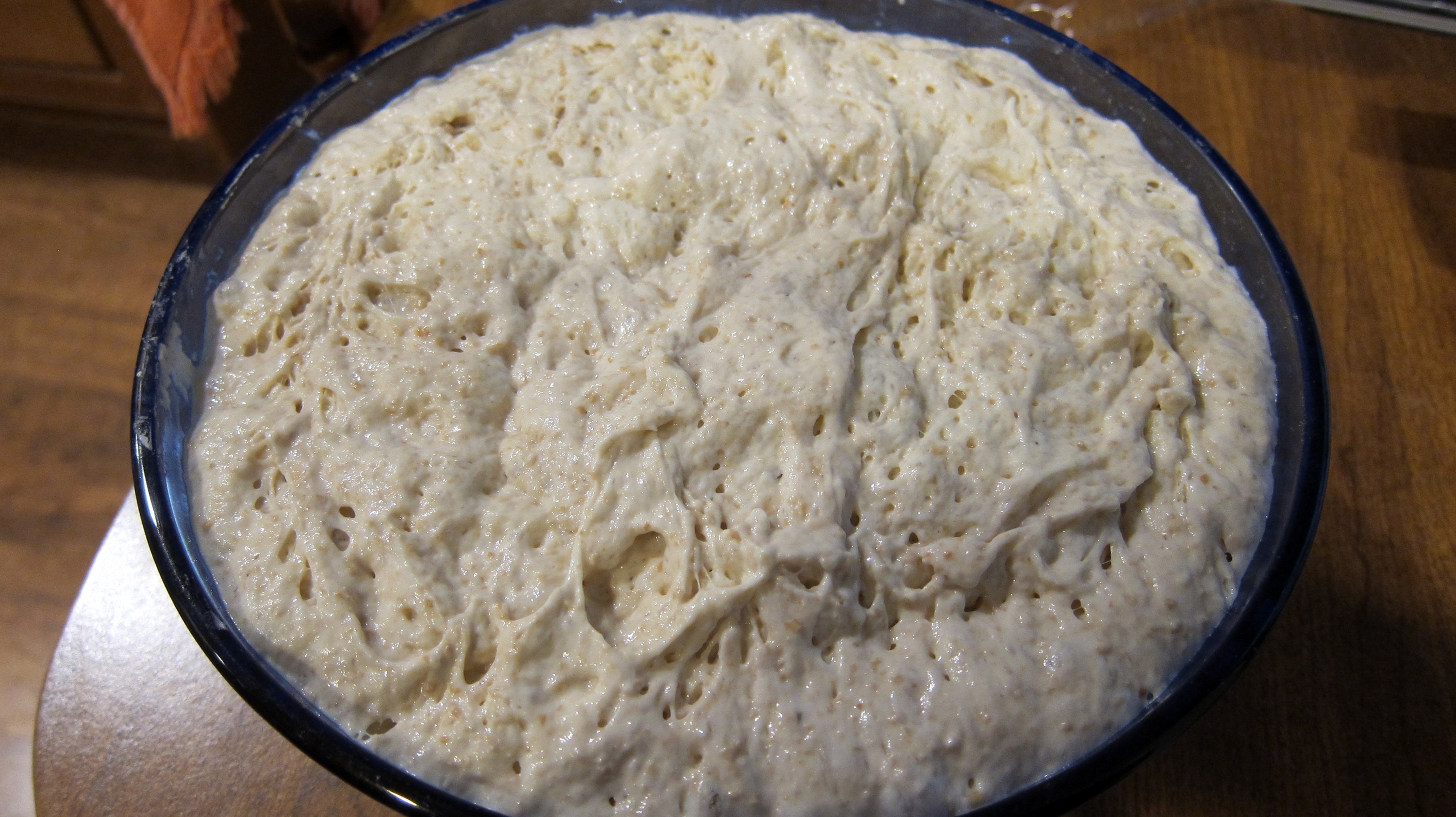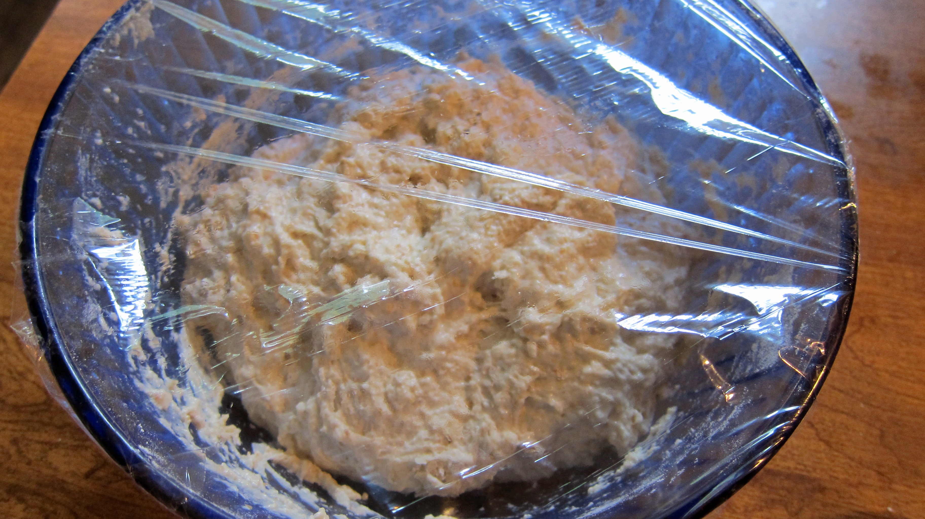 Cover the bowl with plastic wrap and allow to rise in a warm place for 18 hours. Best temperature is 80-85 degrees F. I found if I turn my oven on for 25 seconds and then shut it off, the temperature inside the oven will reach 85 degrees F. It will stay close to that for the 18 hours. Just make sure you have a kitchen thermometer handy to make sure of the temperature. If you are doubtful, just leave it on your kitchen counter.