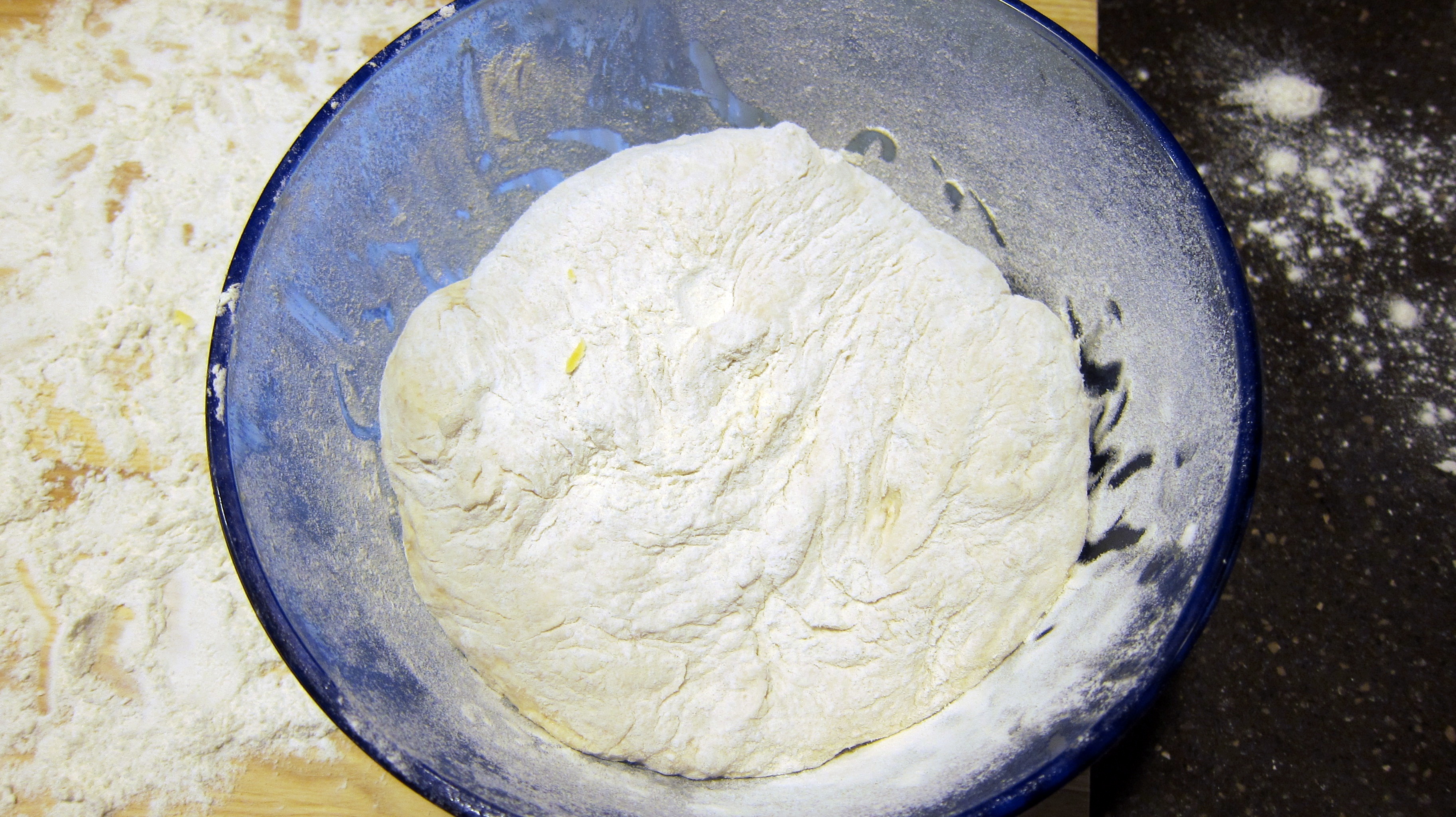 Sprinkle some flour in a greased bowl that will hold the dough with enough room to double in size. Allow the dough to rise 2 hours in the bowl covered.